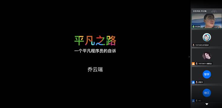 接下来是乔云瑞学长,2014级的计算机科学与技术专业毕业生,毕业在微博视频部门任职期间,先后负责微博故事的生产消费业务、小视频消费业务以及星球视频(即将上线)的从零开发,2020年5月份加入快手消费部门。学长以“平凡之路”作为总括,具体介绍了自己的大学四年生活的每个阶段,他分别用一个关键词概括,既讲述了大学如何规划为同学们提供方向指导,又指出了专业学习的技巧与方法,在鼓励自学的同时也提醒积极参加比赛,在项目中提升自我。之后详细讲述应聘工作中如何应对社招和校招两种招聘,对比提出更深入的技术要求。