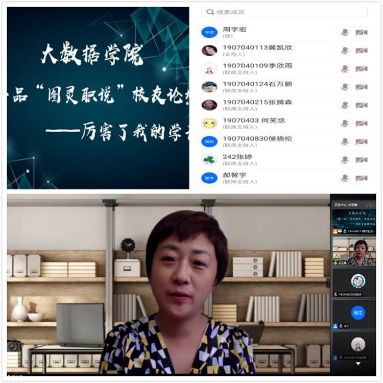 2020年7月4日下午3点,大数据学院在腾讯会议开展“一院一品”项目第三期“图灵职说”校友论坛——厉害了我的学长学姐,旨在疫情期间通过优秀校友的分享帮助同学们解决居家学习的困惑和迷茫。学院党委书记郭书杰老师,校团委副书记刘玉巍老师,学院党委副书记杨晓东老师,学生科科长魏春燕,团委周宇宏老师及全体辅导员、班主任等参加了此次论坛,二百四十余名学生收听了此次论坛。