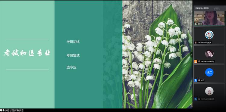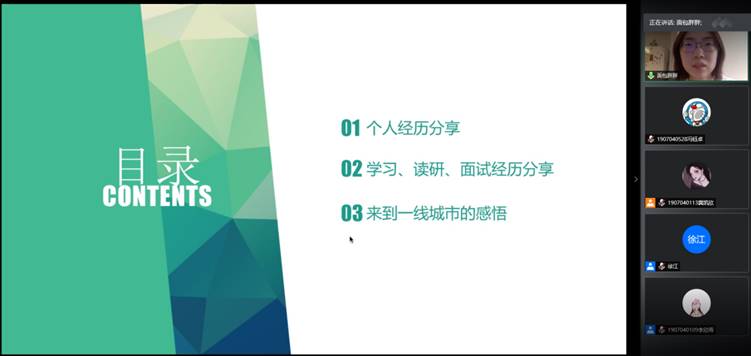 第三位主讲人李珍珍学姐是2012级网络工程专业毕业生,以面试成绩专业第二考入北京科技大学计算机与通信工程学院。研究方向为自然语言处理,申请了一项有关知识补全的国家专利,荣获优秀研究生称号。入职民生银行。学姐从考研的意义与重要性出发,侧重从心理方面,进步空间,学校选择及二战等方面详细介绍了考研的整个过程及准备技巧,全面详细,并同学们解释了考研初复试及专业的选择。