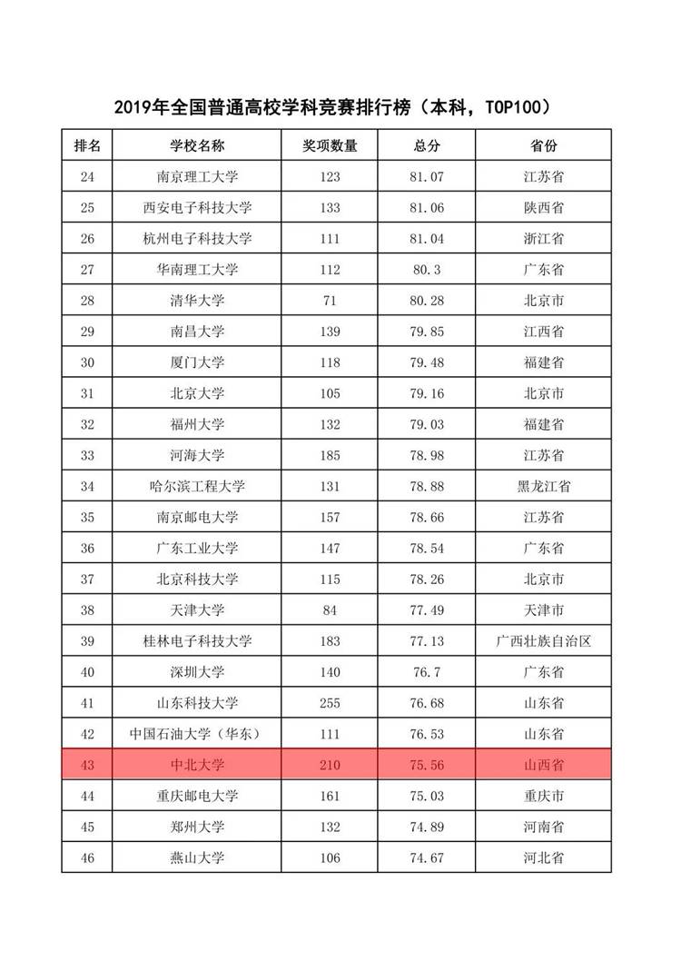 其中,在《2019全国普通高校学科竞赛排行榜》中,我校位列第43名(去年此项排名为100名),位居全省第一,获历史性新突破;在《2015-2019年全国普通高校学科竞赛排行榜》位列第69名(去年此项排名为86名),位居全省第二;同时,在首次推出的《2015-2019年全国地方本科院校学科竞赛排行榜》中位列第24名,位居全省第二!