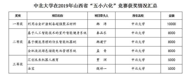 山西省2019年“五小六化”竞赛活动结果日前揭晓。经专家组评选,全省大中专学校有32项成果获奖,我校报送的六件作品全部获奖,其中获一等奖1项、二等奖3项、三等奖2项。省总工会对获得一、二、三等奖的项目分别奖励10000元、8000元、5000元。我校被授予2019年山西省“五小六化”竞赛优胜单位。