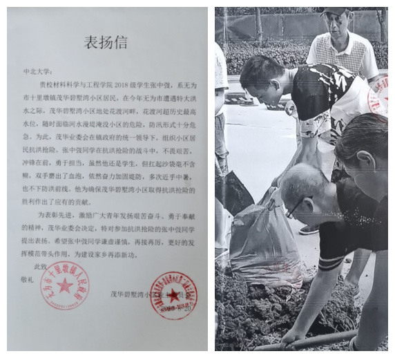 近日,安徽省无为市十里墩镇人民政府向我校材料科学与工程学院发来表扬信,充分肯定了学院2018级学生张中弢同学在当地抗洪救灾中的突出表现。