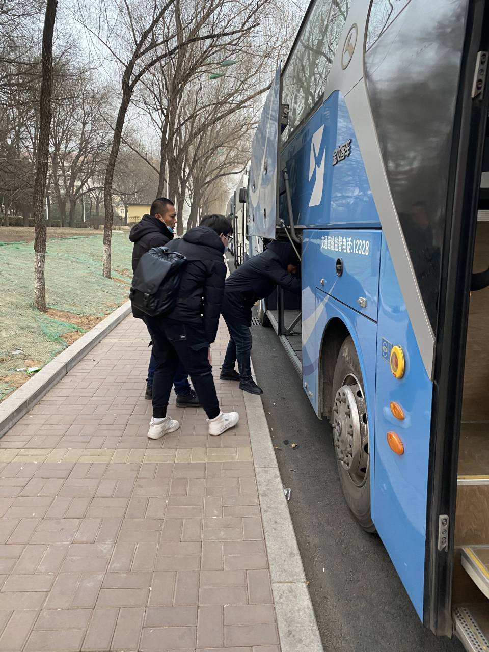 13日下午5点半,在东区北环路和西区二道门外,我们看到均停留着十余辆送站大巴。寒风中,司机师傅耐心地帮每位拿着离校证明前来乘车的同学把行李安置妥当,引导他们有序上车。