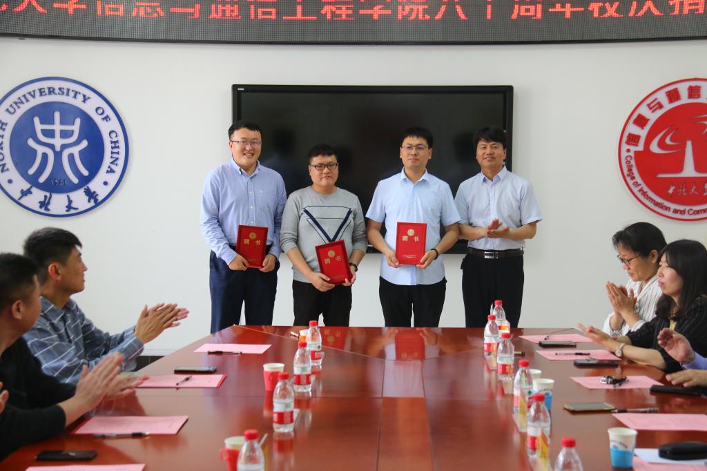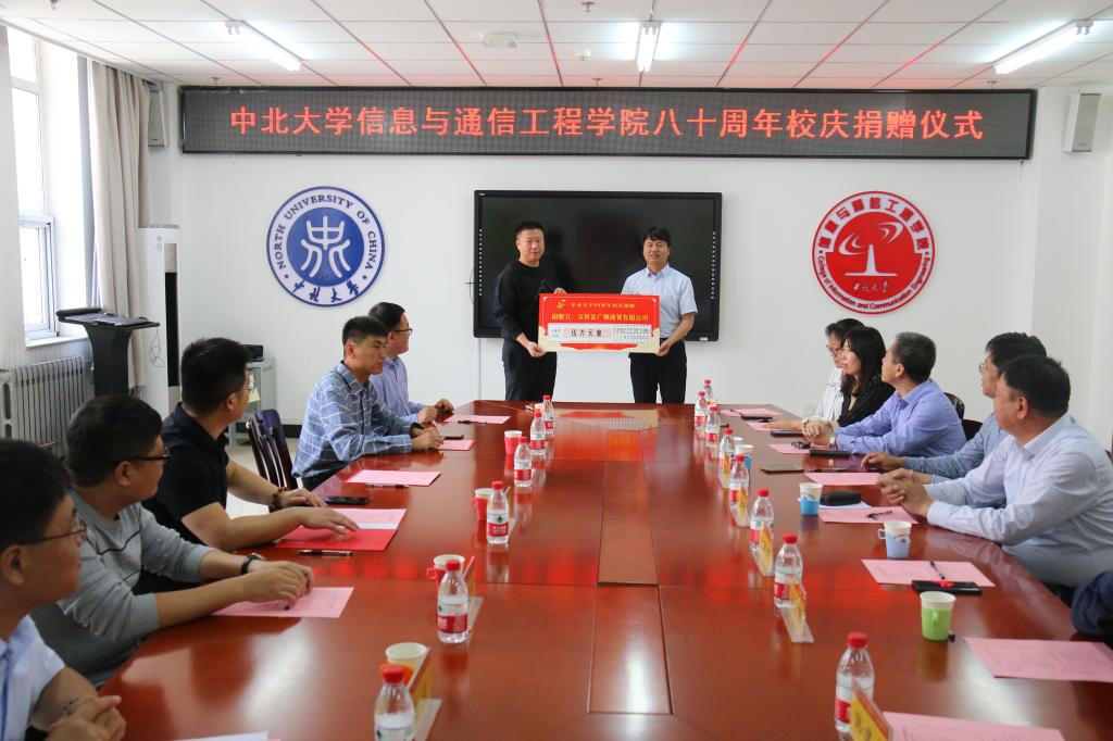 饮水思源,学成念师。5月14日上午,信息与通信工程学院80周年校庆捐赠仪式在院楼713会议室隆重举行。山西灏峰源科技有限公司总经理郭文峰、北京方正世纪信息系统公司总经理李军、玉田县广顺商贸有限公司总经理静海涛,校友柴俊、张建峰、光建斌,中北大学副校长赵贵哲、工程训练中心主任赵正杰、中北大学教务处副处长高春强、学院全体院领导出席捐赠仪式。会议由党委副书记兼副院长魏媛媛主持。