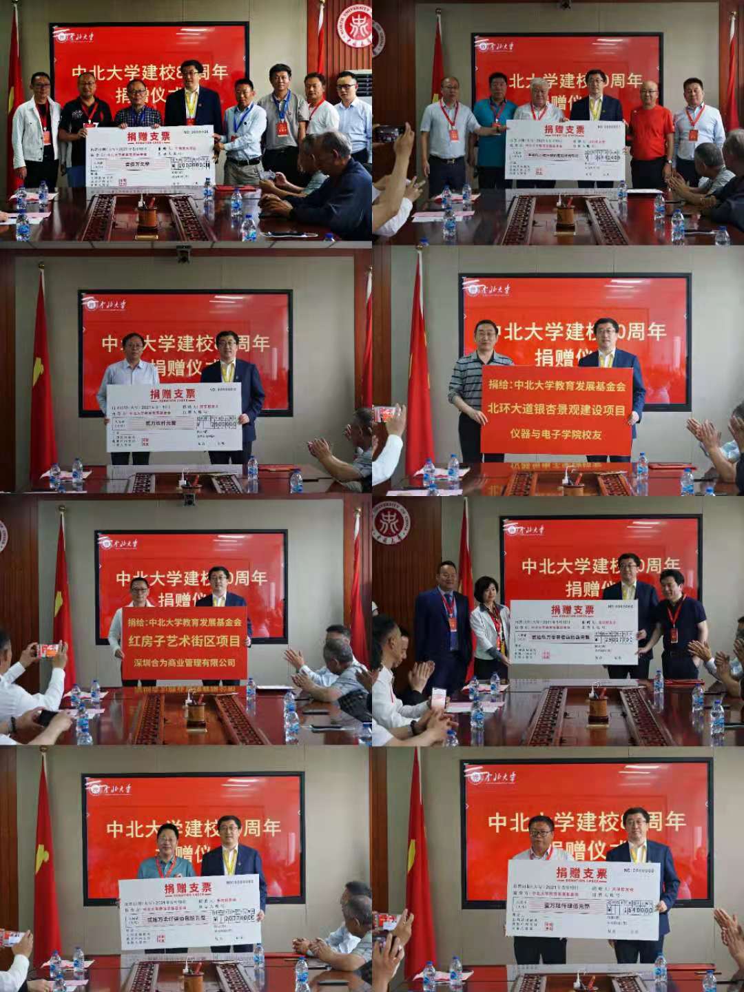 粤港澳大湾区校友会为我校校友科技大厦、中北大学历史文化群雕项目进行了捐赠;王永一校友为刘鼎文化园项目进行了捐赠;仪器与电子学院校友为北环大道银杏景观建设项目进行了捐赠;陈东辉校友为红房子艺术街区项目进行了捐赠;重庆校友会为东门广场音乐喷泉项目进行了捐赠;山西校友会为太机老校门复原景观项目进行了捐赠;山西晋中理工学院向学校捐赠100万元;北京、天津、上海、陕西、南京、福建、河南、湖南校友会分别向母校进行了捐赠。