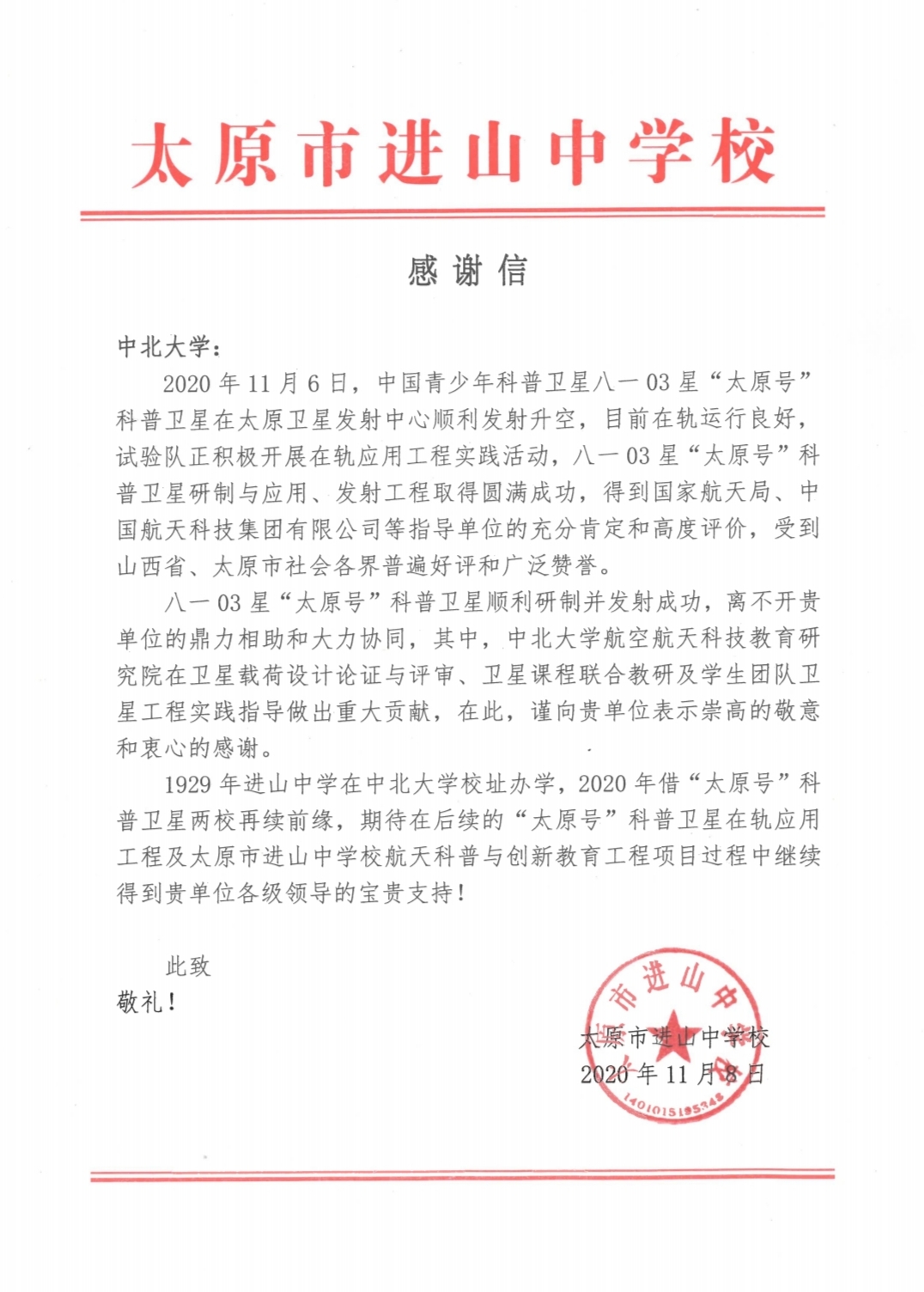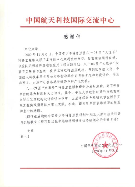 “八一03星‘太原号’科普卫星顺利研制并发射成功,离不开贵单位的鼎力相助和大力协同,其中,中北大学航空航天科技教育研究院在卫星载荷设计论证与评审、卫星课程联合教研及学生团队卫星工程实践指导做出重大贡献。”建校80周年之际,中国航天科技国际交流中心、太原市进山中学校分别发来感谢信,对我校长期以来的支持表示衷心感谢,向学校参研参试人员的辛勤付出表示崇高的敬意。