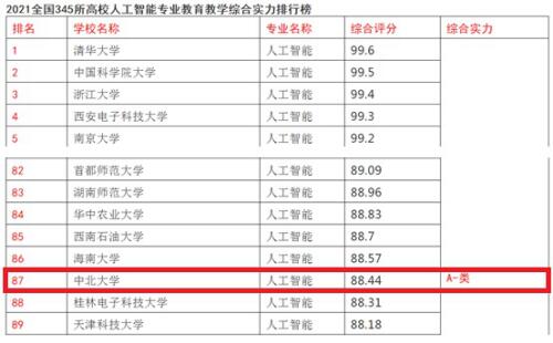 为全面反映我国高校“人工智能”专业(本科)的教育教学总体规模、行业地区分布状况及发展水平,促进高校智能科学与技术教育事业健康、持续发展,2021年4月~6月,全国高校人工智能与大数据创新联盟针对全国已经开办、正在开办、即将开办“人工智能”专业的345所普通高校进行调研。调研内容包括高校自身的品牌影响力、高校智能科学与技术专业师资力量建设情况、人才培养方案和目标、课程体系建设情况、专业教材开发与人员投入情况、人工智能实验室建设与运行情况、教学成果、智能科学与技术实训基地服务能力、教师接受智能科学与技术知识培训的人数与次数、举办人工智能活动的次数及规格规模等10个方面。综合打分、抽样调研,并最终以“排行榜”的形式向社会公布调研结果。本次调研结果将当前高校人工智能专业教育教学总体实力划分为A、B、C、D四类,每类再划分为三档。其中,A类三档包括:A+、A、A-,表示人工智能专业教育教学综合实力总体水平位居全国高校之首。