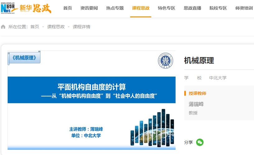 近日,我校《机械原理》《大国兵器》课程思政案例在新华网新华思政平台上线展播,向全社会开放共享。新华网是国家级网络媒体平台,“新华思政”教学资源服务平台依托新华网作为互联网新闻传播的国家队、主力军的平台优势,充分发挥新华网国家级媒体的传播优势、报道优势,紧密结合全国各地高校开展高等学校思政课教育教学的需求,打造创新型“思政+”教育的新模式,并提供一体化思政教育教学综合解决方案。《机械原理》《大国兵器》课程思政案例在新华网的上线,为我校课程思政建设形成了良好的示范效应。