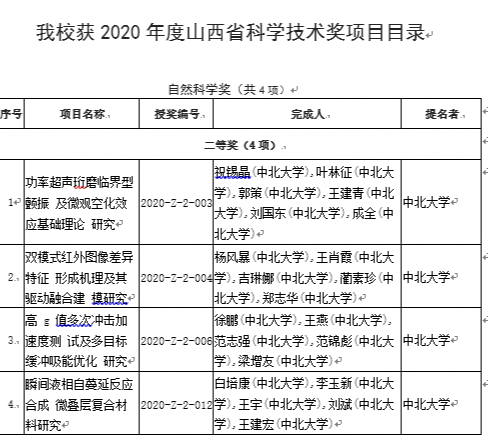 近日,山西省政府印发《关于2020年度山西省科学技术奖励的决定》,对促进我省科学技术进步和经济社会发展作出突出贡献的科学技术人员和组织给予奖励,共授予19个项目一等奖、85个项目二等奖、89个项目三等奖,10家企业获“企业技术创新奖”。本年度我校共获奖8项,其中技术发明一等奖1项、自然科学二等奖4项、技术发明二等奖2项、科技进步三等奖(参与)1项。