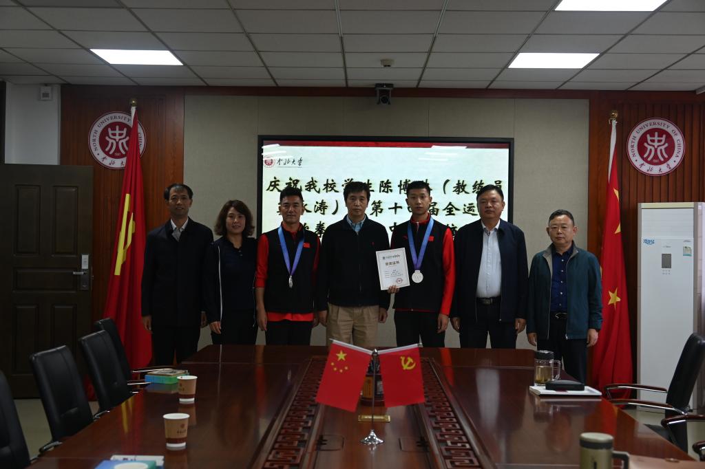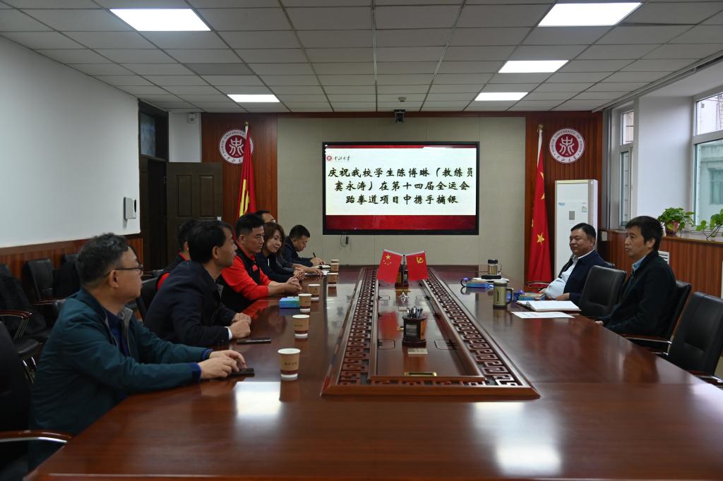 第十四届全国运动会于9月15日-27日在陕西省举办,我校研究生陈博琳在教练员窦永涛老师带领下,勇夺跆拳道男子68公斤级银牌。来自全国各省、区、市33支代表队、137名运动员参加了跆拳道项目的比赛。经过4天、170场比赛,共产生了8枚金牌、8枚银牌、16枚铜牌。决赛在CCTV-5+频道进行了同步直播。10月4日,校长熊继军、副校长赵贵哲与载誉归来的陈博琳、窦永涛及学院领导进行座谈。