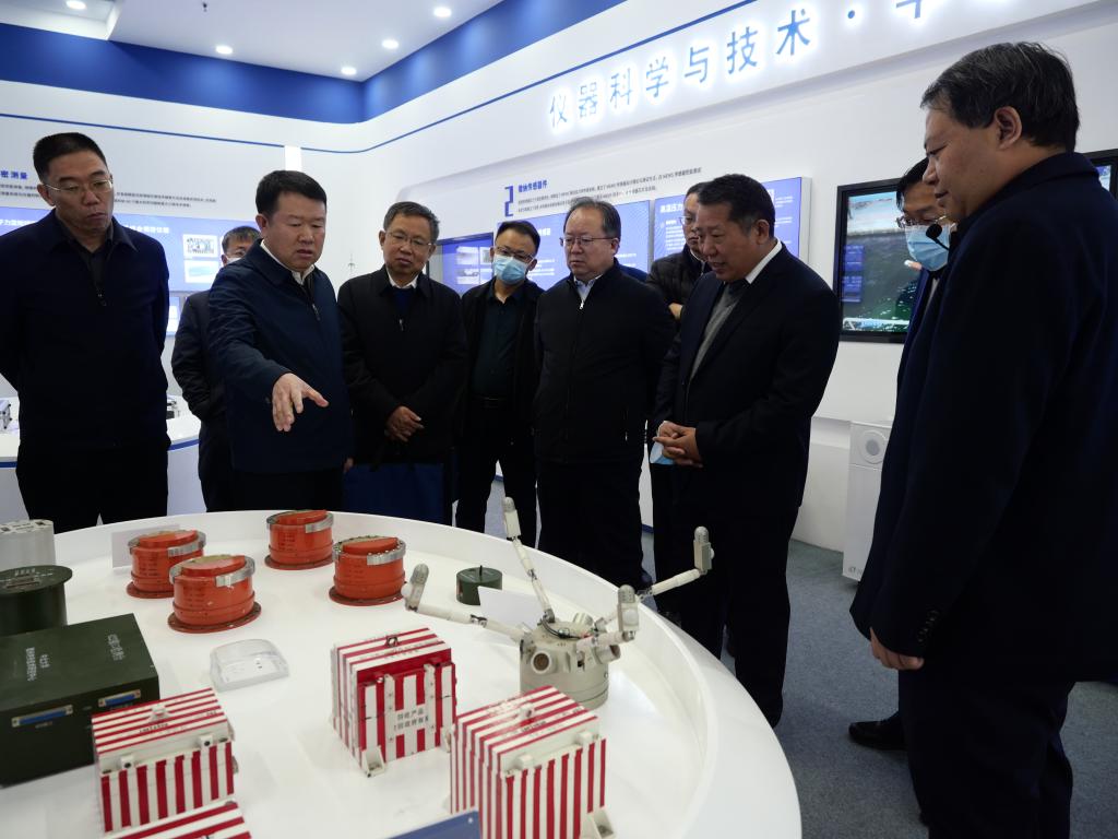 座谈会前,校党委书记沈兴全陪同杨军一行参观了学校科技成果展。