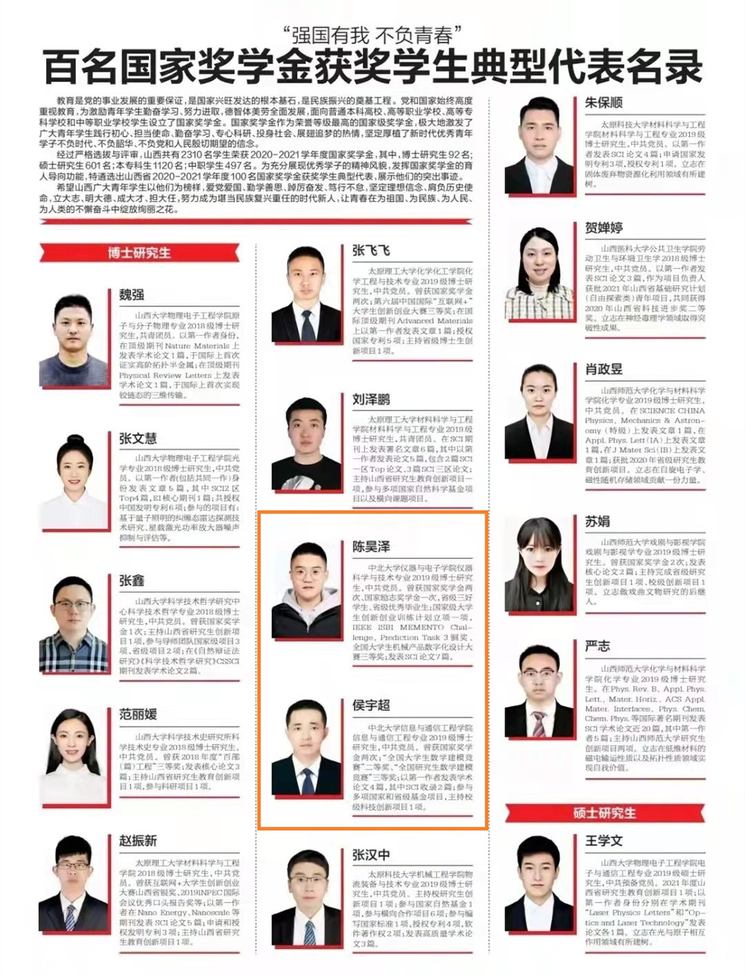 为充分展现优秀学子的精神风貌,发挥国家奖学金的育人导向功能,由山西省教育资助与保障中心组织评审,经严格选拔、优中选优,遴选出山西省2020-2021学年度100名国家奖学金获奖学生典型代表,通过山西晚报媒体平台集中展示其突出事迹。其中,我校6名博、硕士研究生,5名本科生入选,入选人数全省高校第一。