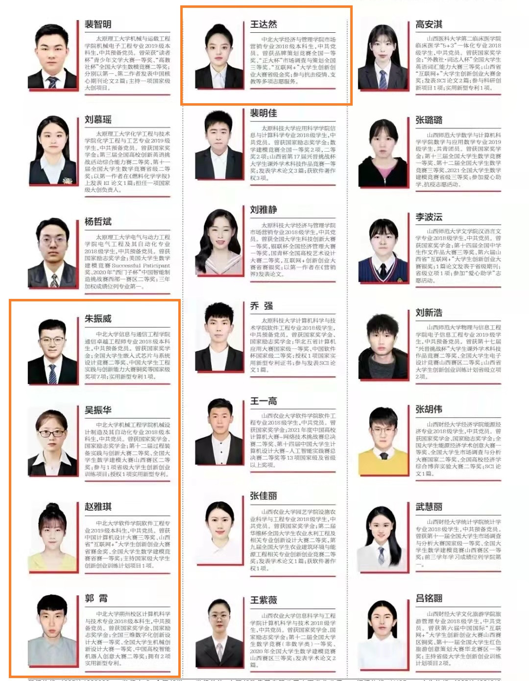 2019级博士研究生、仪器与电子学院仪器科学与技术专业陈昊泽、信息与通信工程学院信息与通信工程专业侯宇超,2019级硕士研究生、机电工程学院兵器科学与技术专业王辰、电气与控制工程学院控制工程专业杨彦茹、环境与安全工程学院兵器科学与技术专业寇勇、艺术学院艺术理论专业梁冰等6名博、硕士研究生,2018级本科生、信息与通信工程学院通信卓越工程师专业朱振威、机械工程学院机械设计制造及其自动化专业吴振华、经济与管理学院市场营销专业王达然、朔州校区计算机科学与技术专业郭霄及2019级软件学院软件工程专业赵雅琪等5名本科生入选。