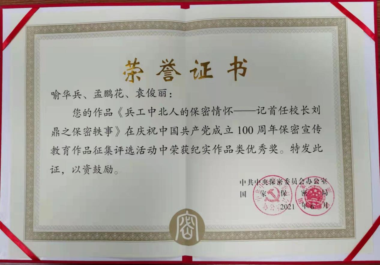 近日,我校保密办2021年供稿参赛的《兵工中北人的保密情怀——记首任校长刘鼎之保密轶事》在“庆祝中国共产党成立100周年保密宣教作品征集评选”中荣获纪实作品类优秀奖,获得中共中央保密委员会办公室、国家保密局颁发的荣誉证书。