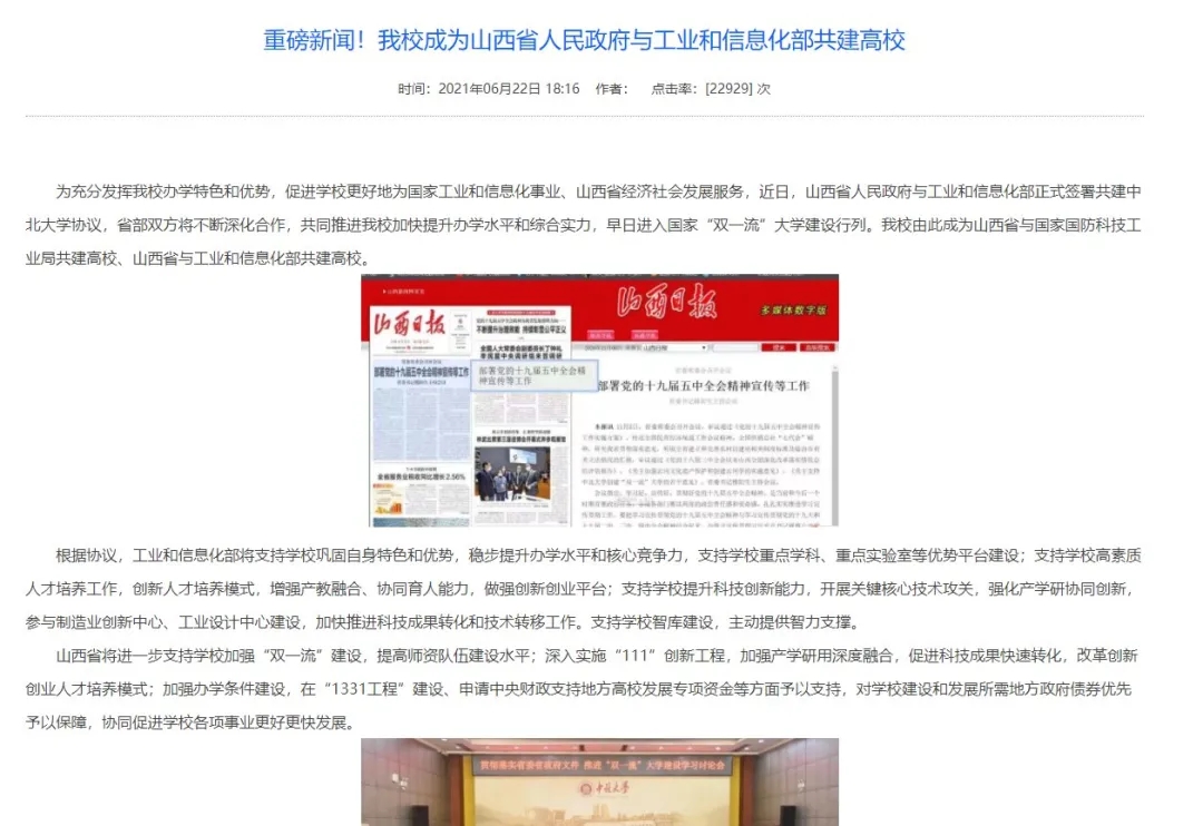 6月23日,山西省政府与工业和信息化部正式签署共建中北大学协议,我校在之前省政府与国家国防科技工业局共建高校的基础上,再成为省政府与工业和信息化部共建高校,成为工信部在全国布局共建的五所高校之一,学校迎来更为广阔的发展空间。