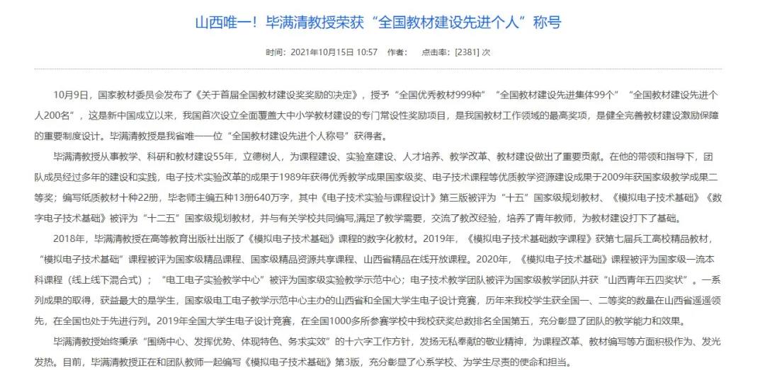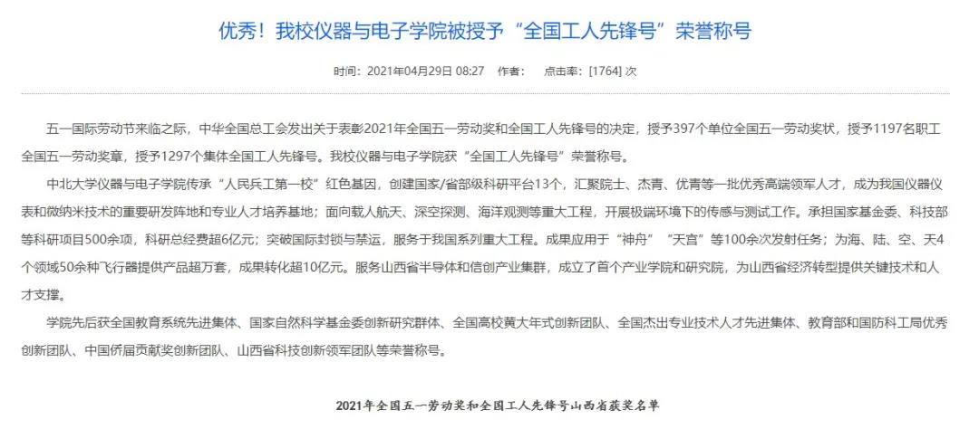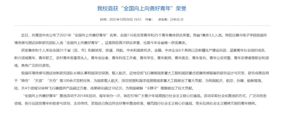 仪器与电子学院荣获“全国工人先锋号”称号;极端环境传感与测试创新研究团队入选“全国向上向善好青年”,这是我校首次获此荣誉,也是今年全省唯一获奖集体;课程思政示范课《大国兵器》上线人民网人民公开课;献礼党的百年华诞,我校制作的“人民军工”国防素质通识类课程思政示范课正式上线发布,实现了思政课程与课程思政的同向同行、同频共振;毕满清教授获评首届“全国教材建设先进个人”,是我省唯一获得者。