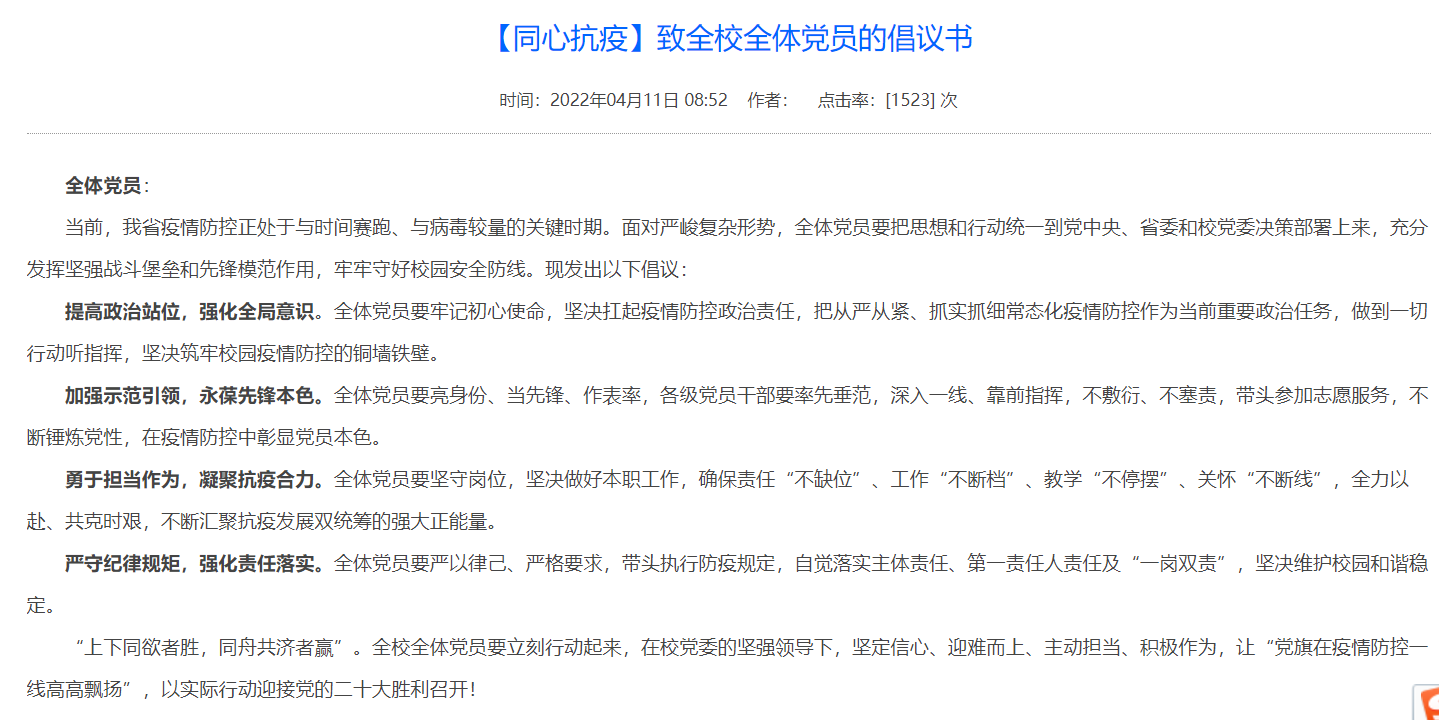 重任面前显担当,越是艰险越向前。疫情发生以来,校领导第一时间召开会议部署疫情防控工作;第一时间发布《致全校全体党员的倡议书》,凝聚思想、统一行动,号召广大党员要充分发挥坚强战斗堡垒和先锋模范作用,牢牢守好校园安全防线。