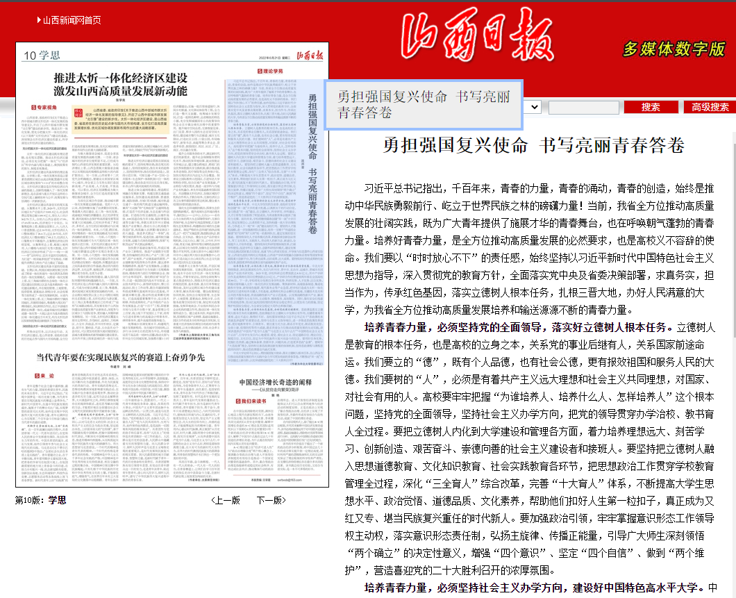 6月21日,《山西日报》学思版全文发表了我校党委书记沈兴全署名文章《勇担强国复兴使命 书写亮丽青春答卷》。