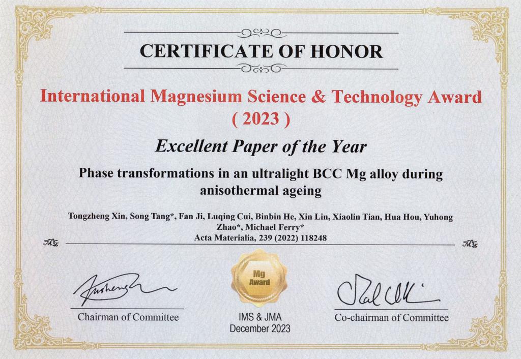 同期,项目相关成果“材料设计和工艺优化宏微观统一相场EasyPhase/Cast智能控制系统”受邀参加第三届亚洲创新发明展览会(香港展),获得金奖;发表在国际金属顶级期刊的相关论文获得国际镁协2023年度最佳论文奖。