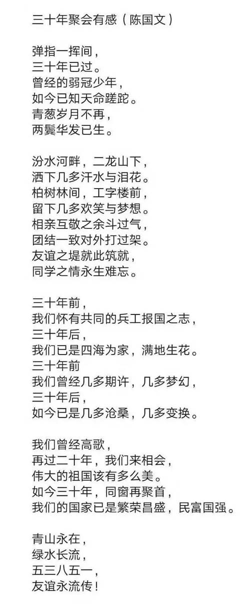 最后,各位同学也都相继畅谈30年经历,并向老师们表达了感激之情。大家无拘无束,一如三十年前,似乎一切都变了,但似乎一切又都没有变。其中,校友陈国文同志还赋诗一首,情深意切。会间,大家畅所欲言,其乐融融。