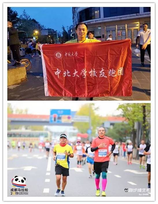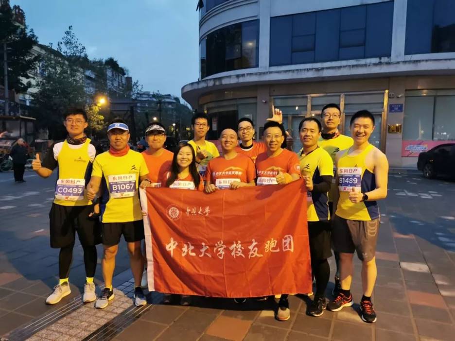 在这万众期许的鸣枪声前,聚拢着十余位红黄相间的健儿,他们互相打趣谈笑间,可谓英姿飒爽,趣味重生。终于,他们铺开了攒在手里的一展红色旗帜,上面中圈的八个刚劲大字——“中北大学校友跑团”道出了他们的来历。如果把长跑看做一场战斗,把全国各地的马拉松赛都看作是一位难啃的大将,那这支跑团战队可谓铿锵有力,势拔五岳,组建以来过关斩将不计其数,更是把胜利锦旗插在了每处腹地。