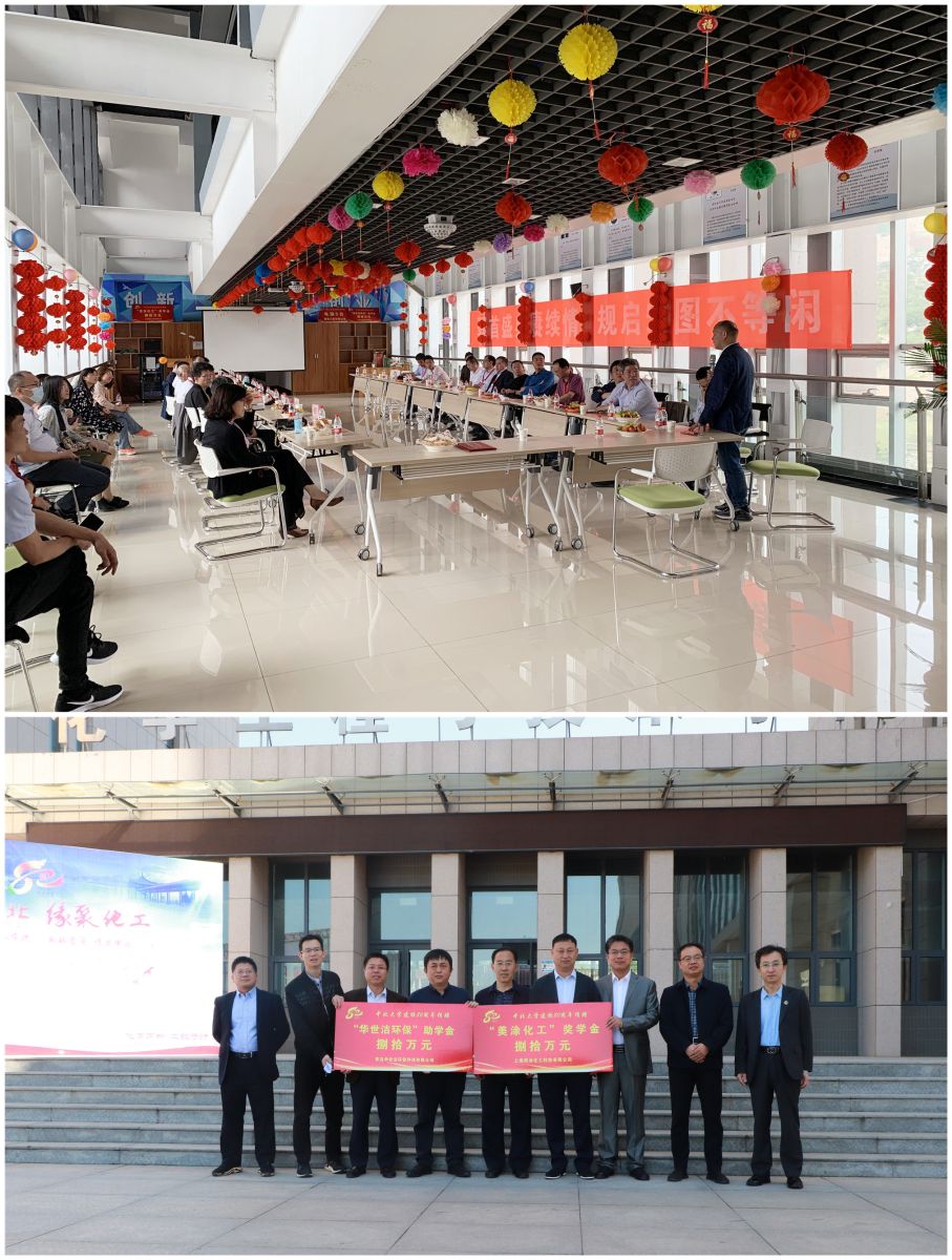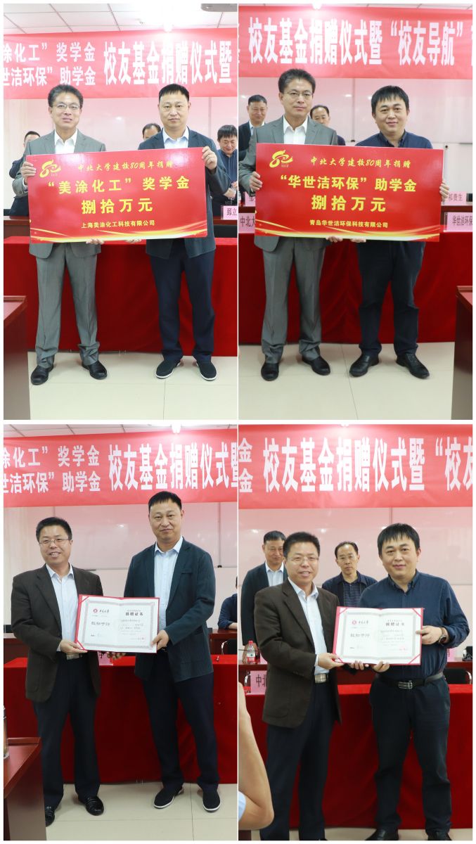 5月18-19日,中北大学化学工程与技术学院“美涂化工奖学金”、“华世洁环保助学金”、“帝斯博奖教金”捐赠仪式在科学楼C座206、七层连廊举行。上海美涂化工科技有限公司董事长邹少华、青岛华世洁环保科技有限公司董事长郅立鹏、帝斯博(常州)医疗用品股份有限公司董事长张柱华;中北大学副校长苏铁熊、校友办主任张胜利、院党委书记廖海洪、院长祁贵生、院党委副书记李云、副院长王海宾、副院长胡志勇出席捐赠仪式。
