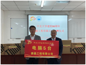 捐赠仪式上,赛鼎工程有限公司向中北大学捐赠电脑五台,院长祁贵生接受捐赠并向赛鼎工程有限公司施福富总工颁发捐赠证书。祁院长对施福富总工、谷磊正高工莅临中北大学并出席中北大学建校八十周年系列活动表示热烈欢迎,并对赛鼎工程有限公司长期以来的支持和帮助表示衷心感谢,希望双方进一步深化交流合作,加强成果转化与技术合作。