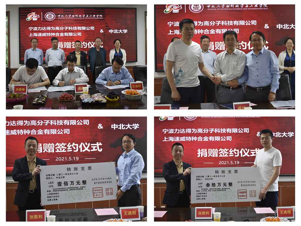 2021年5月18日下午15:30,中北大学与宁波力达得为高分子科技有限公司和上海速威特种合金有限公司捐赠仪式于材料学院会议室举行,我校93级杰出校友、宁波力达得为高分子科技有限公司董事长王选程向中北大学捐款100万元;2002级杰出校友、上海速威特种合金有限公司董事长吴春春捐款30万元,并签订了校企合作协议。出席此次活动的嘉宾和领导有省人大代表贾润礼教授、校友办主任张胜利、材料学院院长侯华、院党委副书记郭云霞、副院长李迎春等。