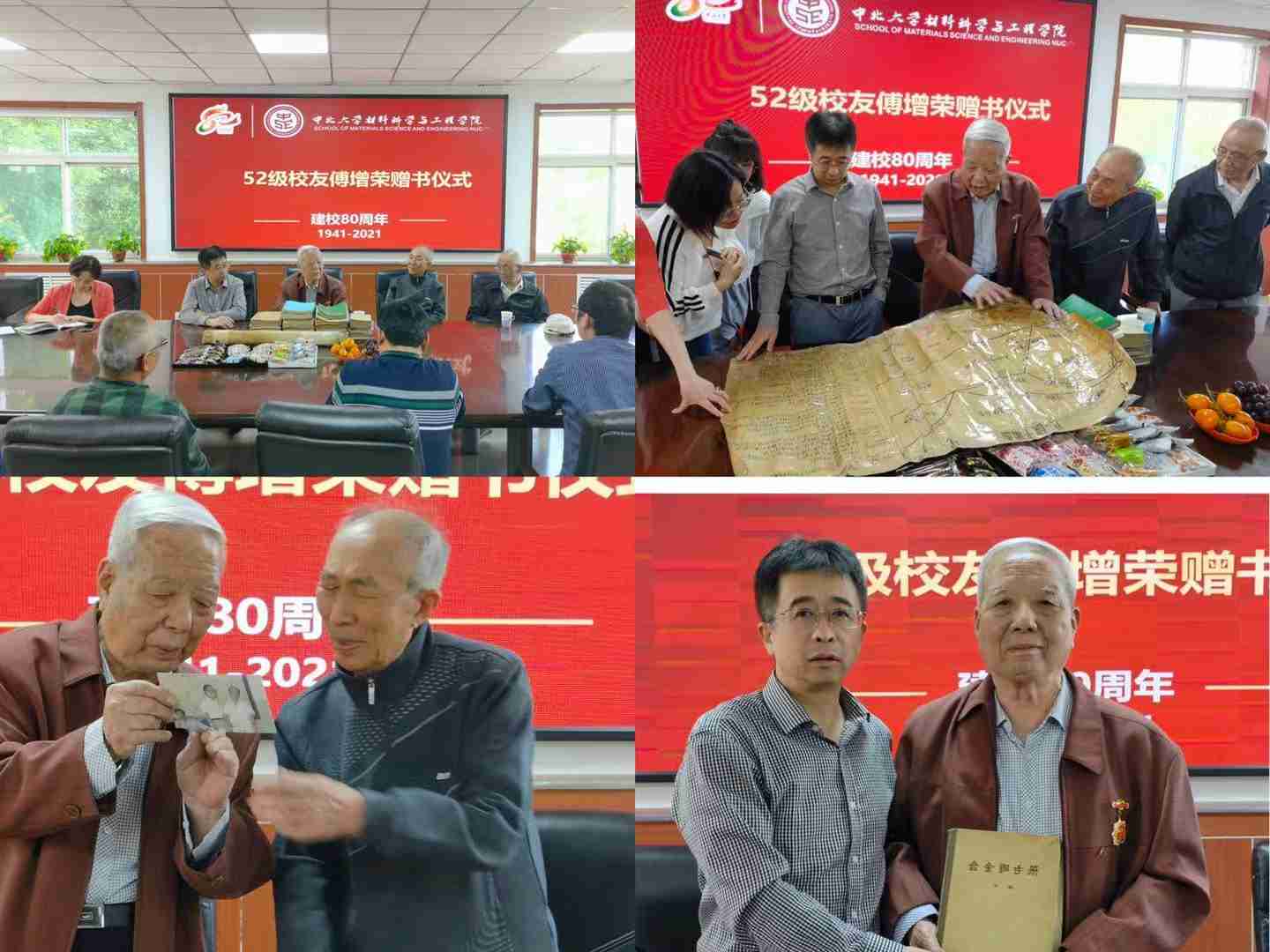 2021年5月17日,材料学院52级金属材料热处理专业的86岁老校友傅增荣带着珍贵的礼物回到学院,以特有的方式为母校80周年献礼。周铁城、张春明、胡保全和院领导共同见证了这一暖心时刻。