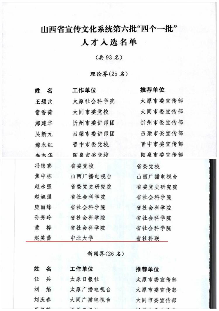 近日,省委宣传部公布山西省宣传文化系统第六批“四个一批”人才入选名单,我校马克思主义学院院长赵笑蕾教授入选山西省宣传文化系统第六批“四个一批”理论界人才。此前,我校艺术学院王燕平、陕军入选我省首批“四个一批”文艺界人才。