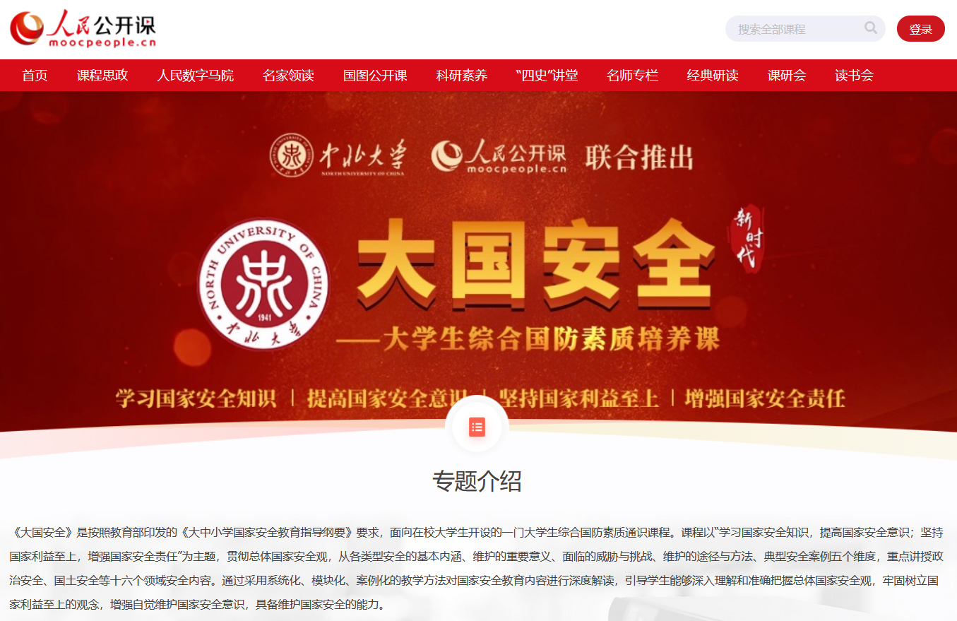 近日,我校建设的又一门“课程思政”特色课--《大国安全》成功上线人民网-人民公开课。此前,该课程已先...